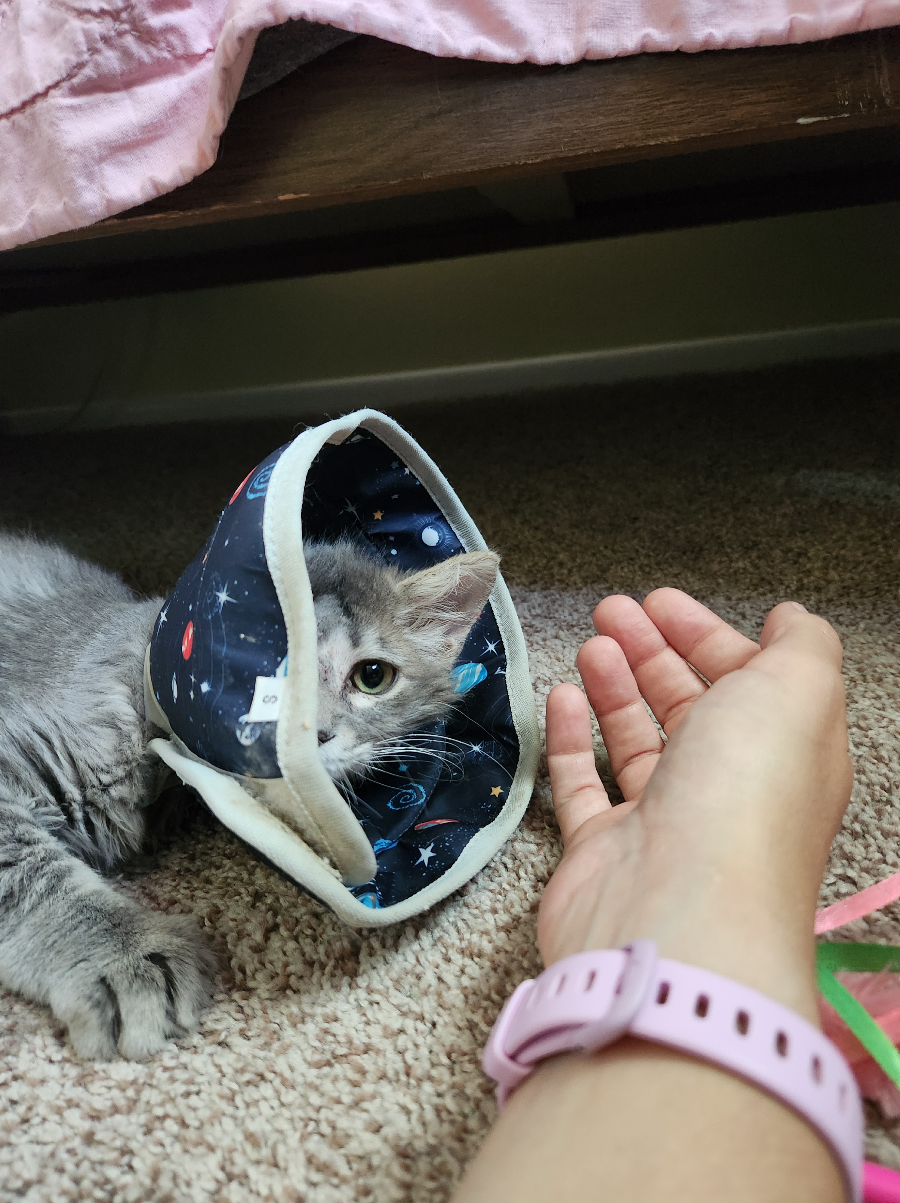 Fast forward to this week: I currently have two sets of fosters: a pair of healthy kittens who were in a quarantine hold due to exposure, but never got sick so they are up for adoption now, and a very shy, slightly hissy singleton kitten who recently had his eye removed and is recovering at my home. This singleton one-eye kitten, Chilaca, is so shy he permanently hides under the spare bed and I have to jam myself under it to get to him each day for medication and socialization.