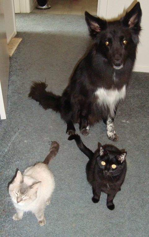 Remember back in March when I adopted my office cat, Amelia, as a hospice situation due to her failing health? Well, she is still kicking and more spunky than ever. Please enjoy my official family photo of my three fur babies!