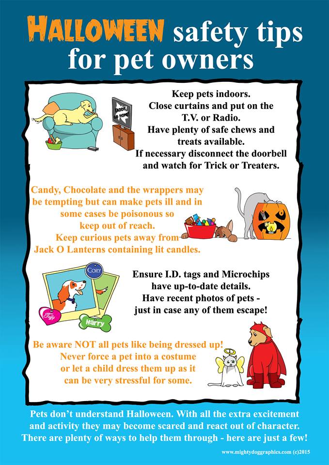 Halloween and Your Pets Posted on October 22, 2015 by jennariedi Pets don’t understand Halloween – and it can be a very scary, unsafe time for them! Please be aware of your pet’s safety and never force them into a costume if they don’t want to wear one. Here is a great graphic on Halloween safety tips: Share this: Click to share on Facebook (Opens in new window) Facebook Click to share on X (Opens in new window) X Like Loading... Related