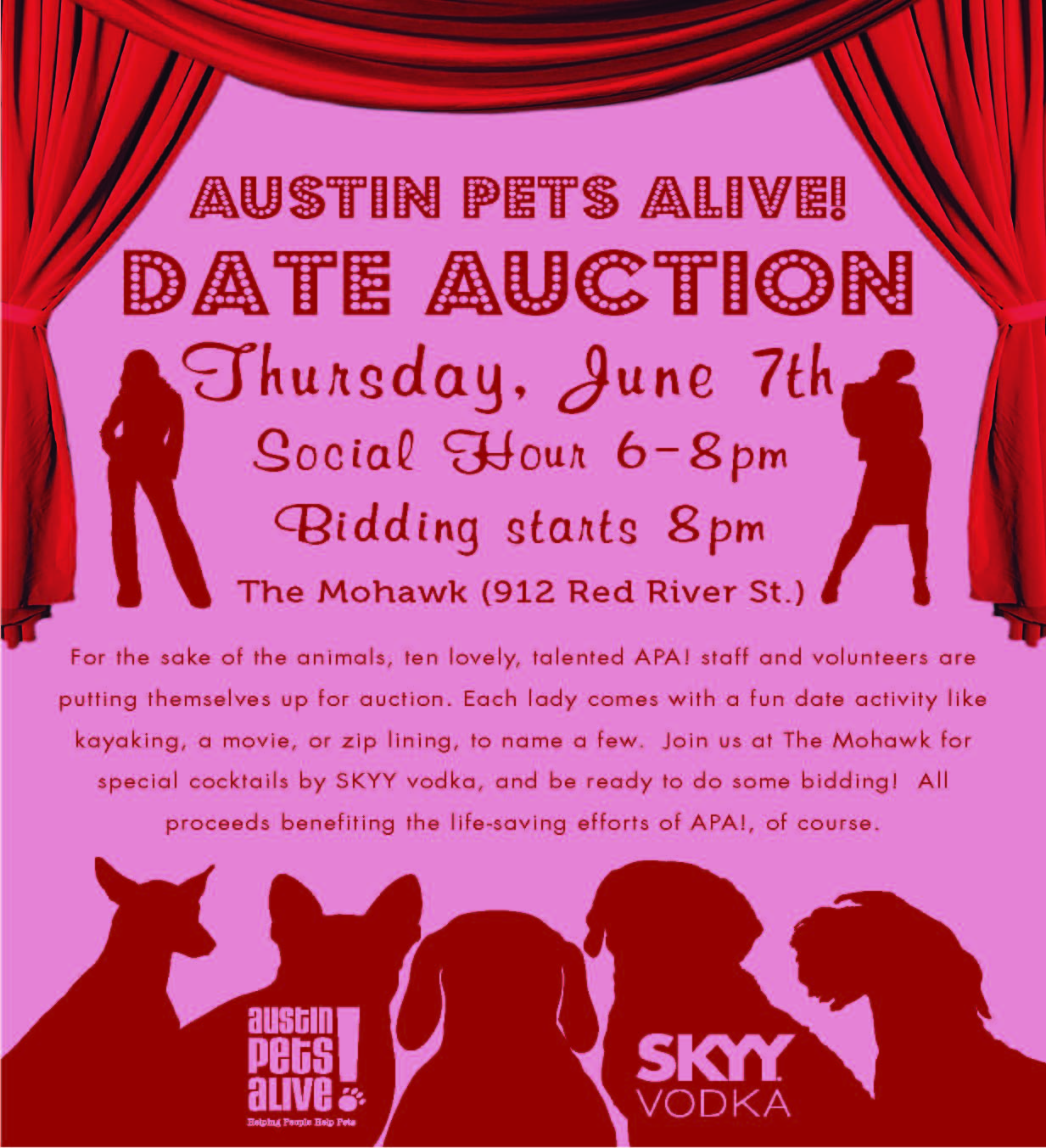 That’s right – I am in a date auction benefiting Austin Pets Alive! Myself and nine other animal lovers are putting ourselves on the bidding block in hopes to raise some funds for the cats and dogs in the amazing programs at APA… if you are in the Austin area on Thursday, June 7 stop by Mohawk between 6 and 9pm to meet the lovely ladies and bid on a chance to go on a fun date with one of us.